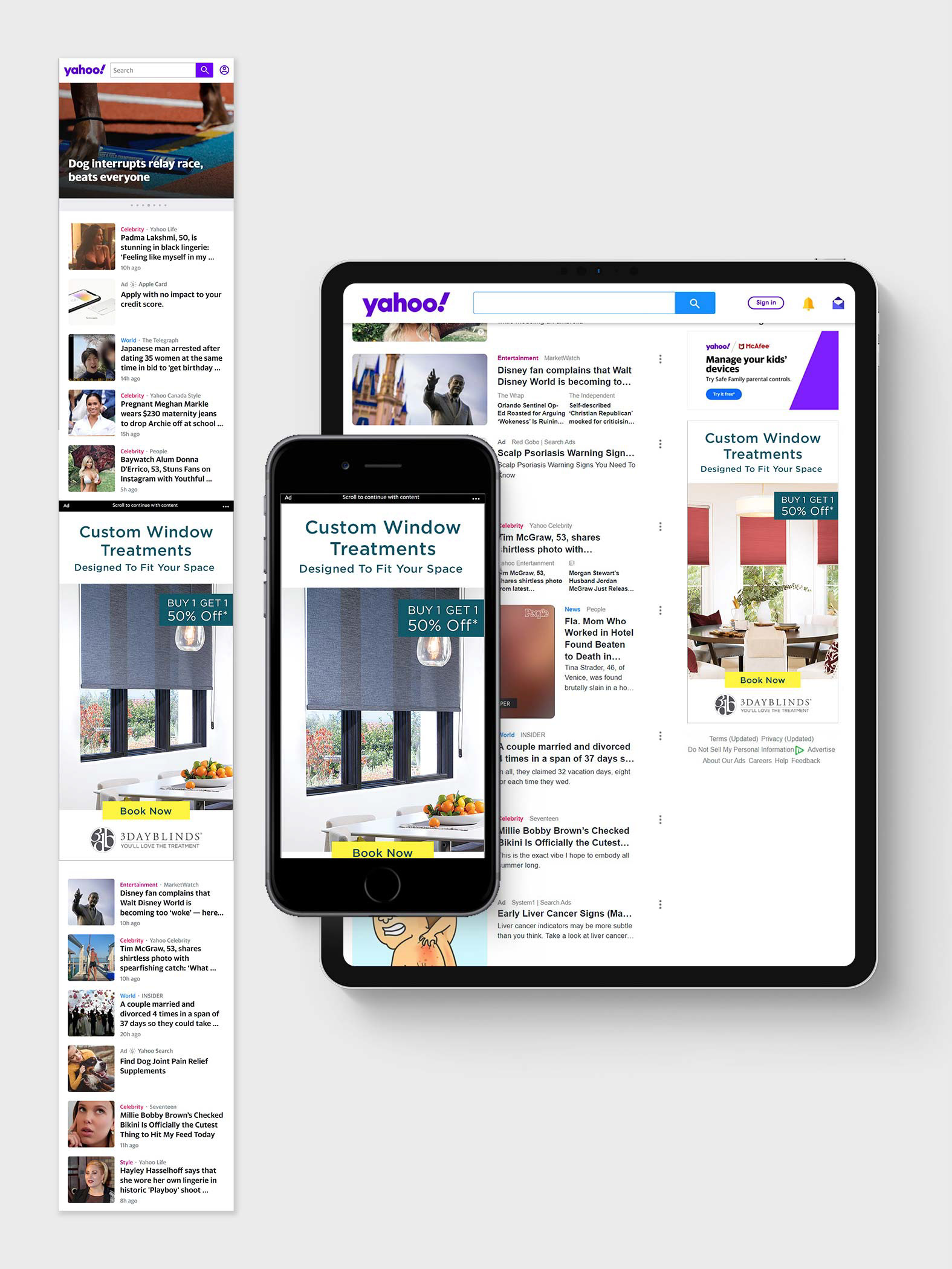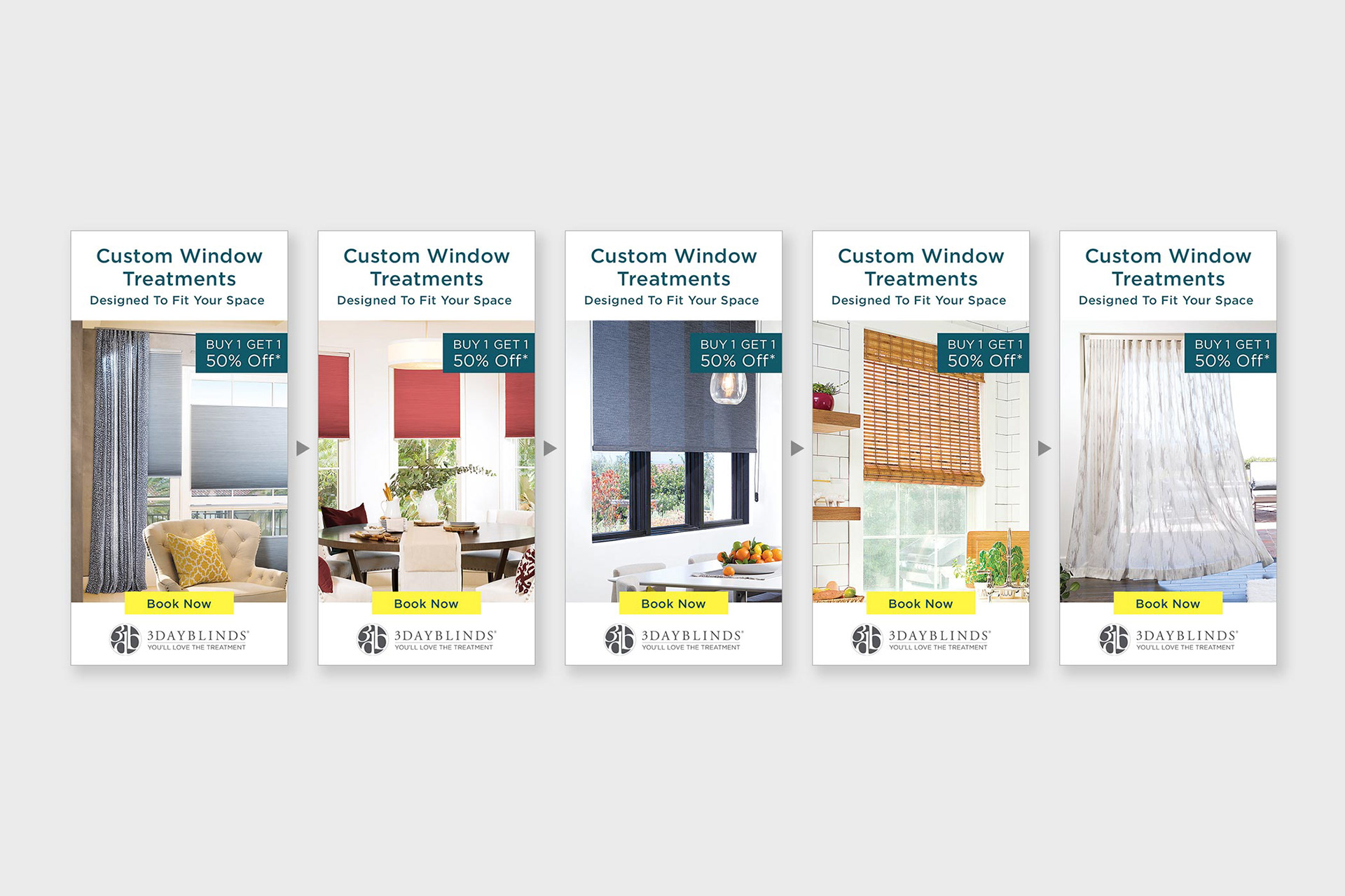 Web banner set is a carousel gallery that rotates images as they are displayed. The objective was to showcase various types of custom window treatments and use the offer as a secondary element.
